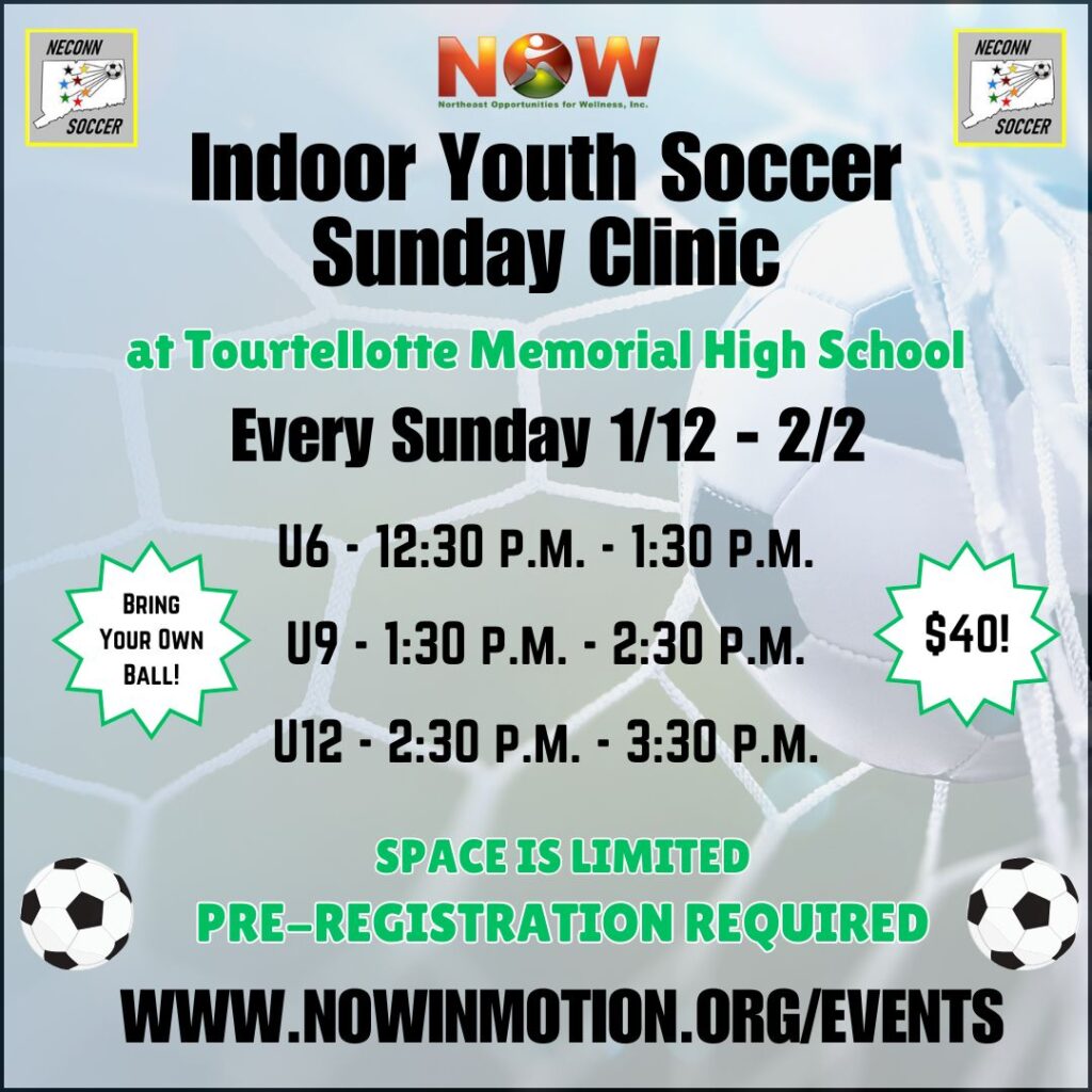 The Soccer Sunday clinic will focus on increasing soccer skills, playing fun soccer games, fostering teamwork, and having fun! This indoor soccer clinic series with NECONN Soccer meets each Sunday at Tourtellotte Memorial High for children in the U6, U9, and U12 age groups!