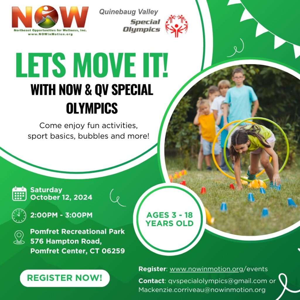 Come join NOW and QV Special Olympics for an hour of fun at Pomfret Recreation Park on October 12th from 2-3PM! We will focus on foundations of sports, play various games, enjoy bubbles and more! This is for ages 3-18, however, if you feel your little is able to engage please register or reach out with any questions :)
