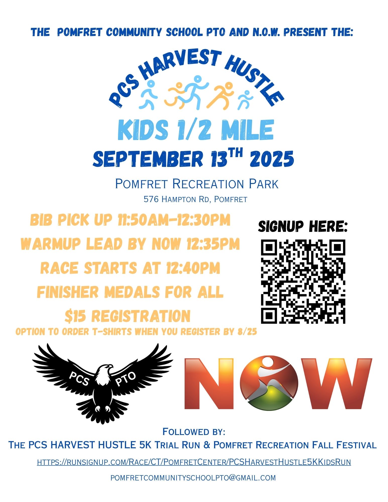 Pomfret Recreation Park 576 Hampton Rd, Pomfret Center, Connecticut, United StatesThis is a paid fund-raiser event organized by the Pomfret Community School PTO. $15 registration fee with an option to order a shirt by August 25th. Bib Pick Up: 11:50 […]