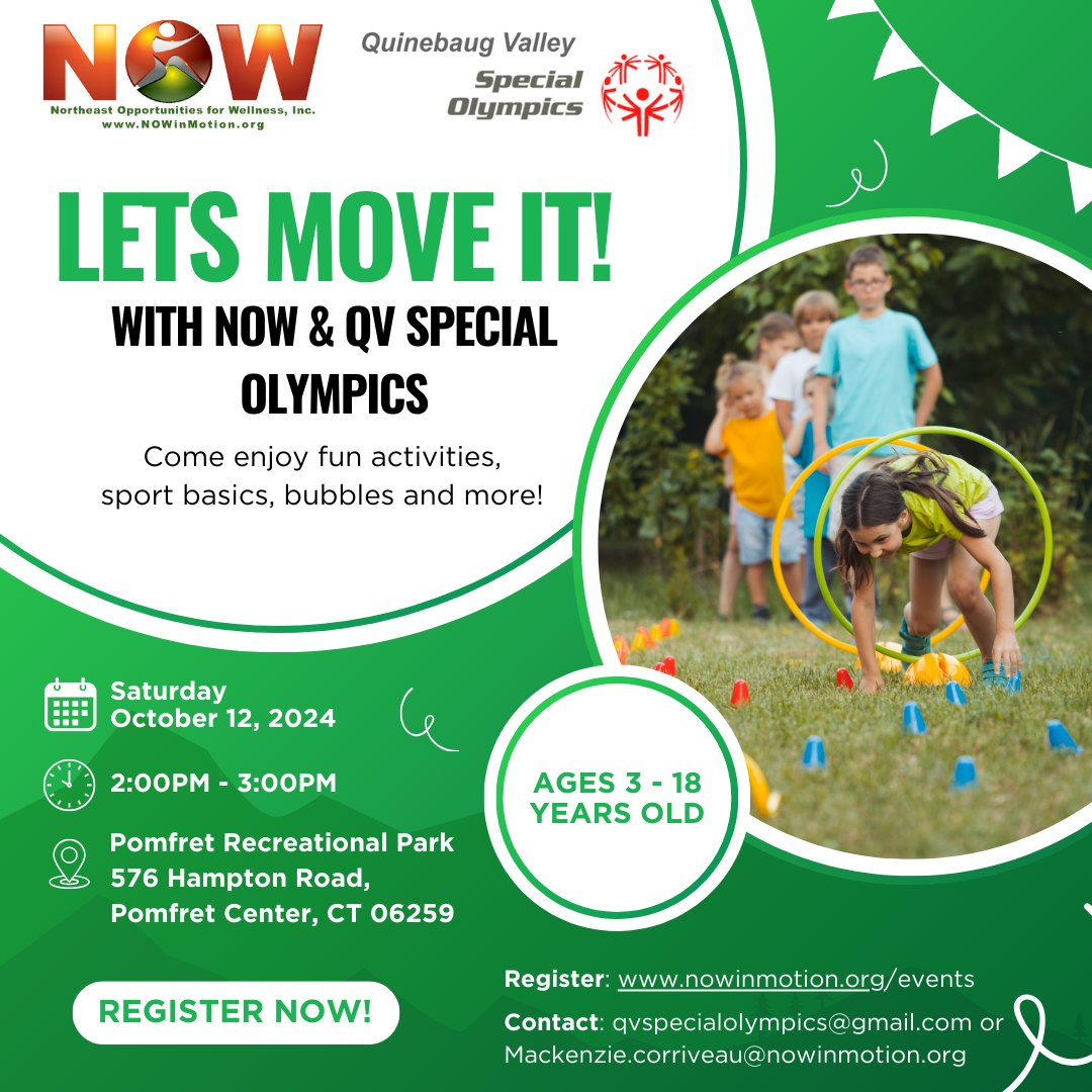 Pomfret Recreation Park 576 Hampton Rd, Pomfret Center, Connecticut, United StatesCome join NOW and QV Special Olympics for an hour of fun at Pomfret Recreation Park on October 12th from 2-3PM! We will focus on foundations of sports, play various games, […]