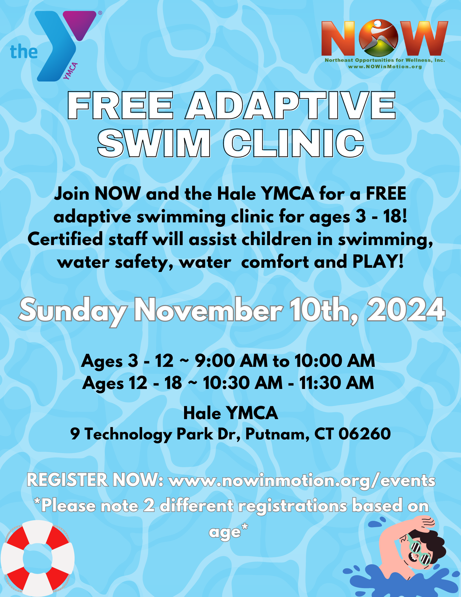 Hale YMCA Youth & Family Center 9 Technology Park Drive, Putnam, Connecticut, United StatesNow has partnered with the Hale YMCA to provide an adaptive swim clinic to those with special needs ages 3 - 18 years old! Certified instructors and volunteers will be in the water to […]